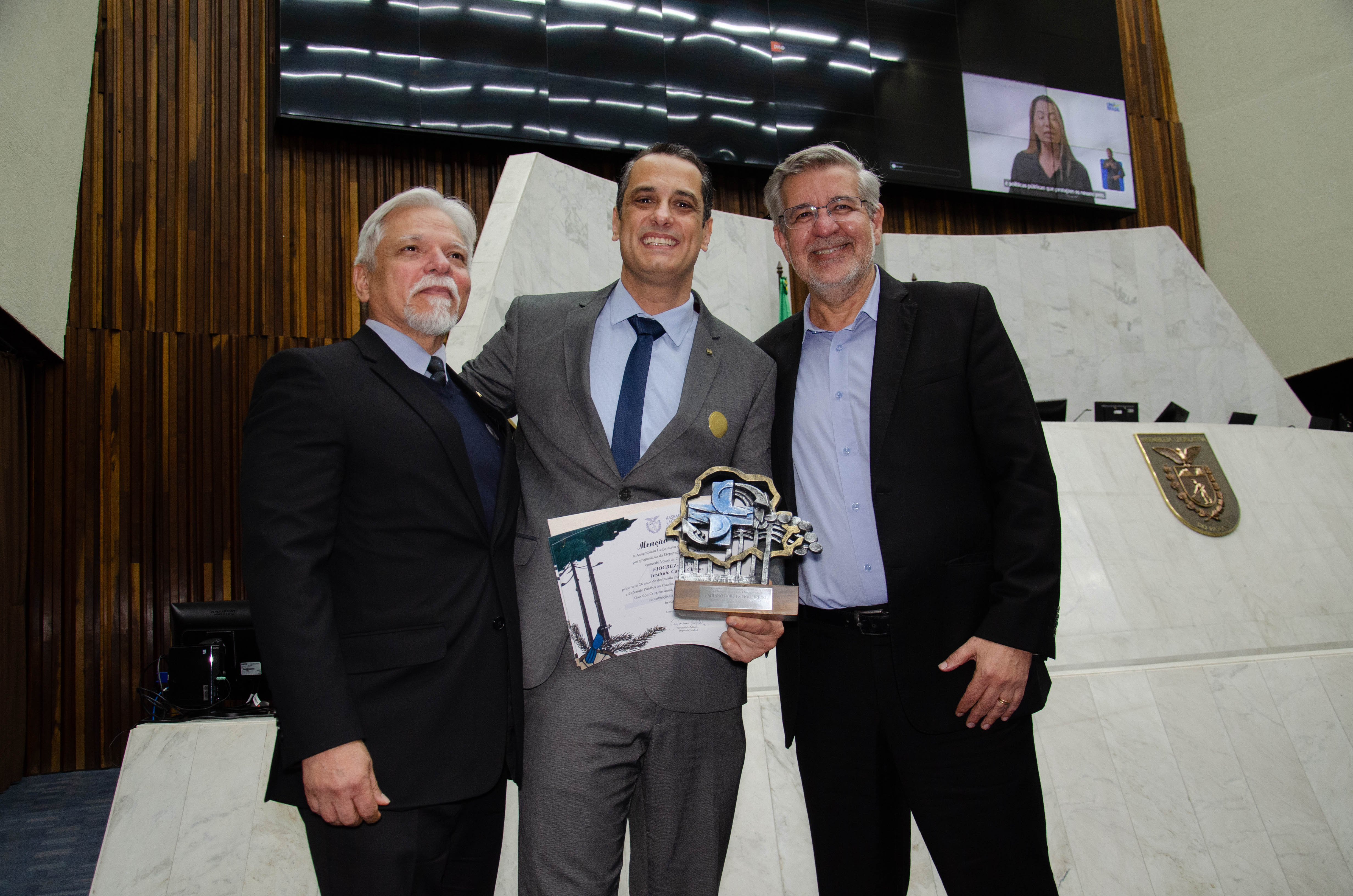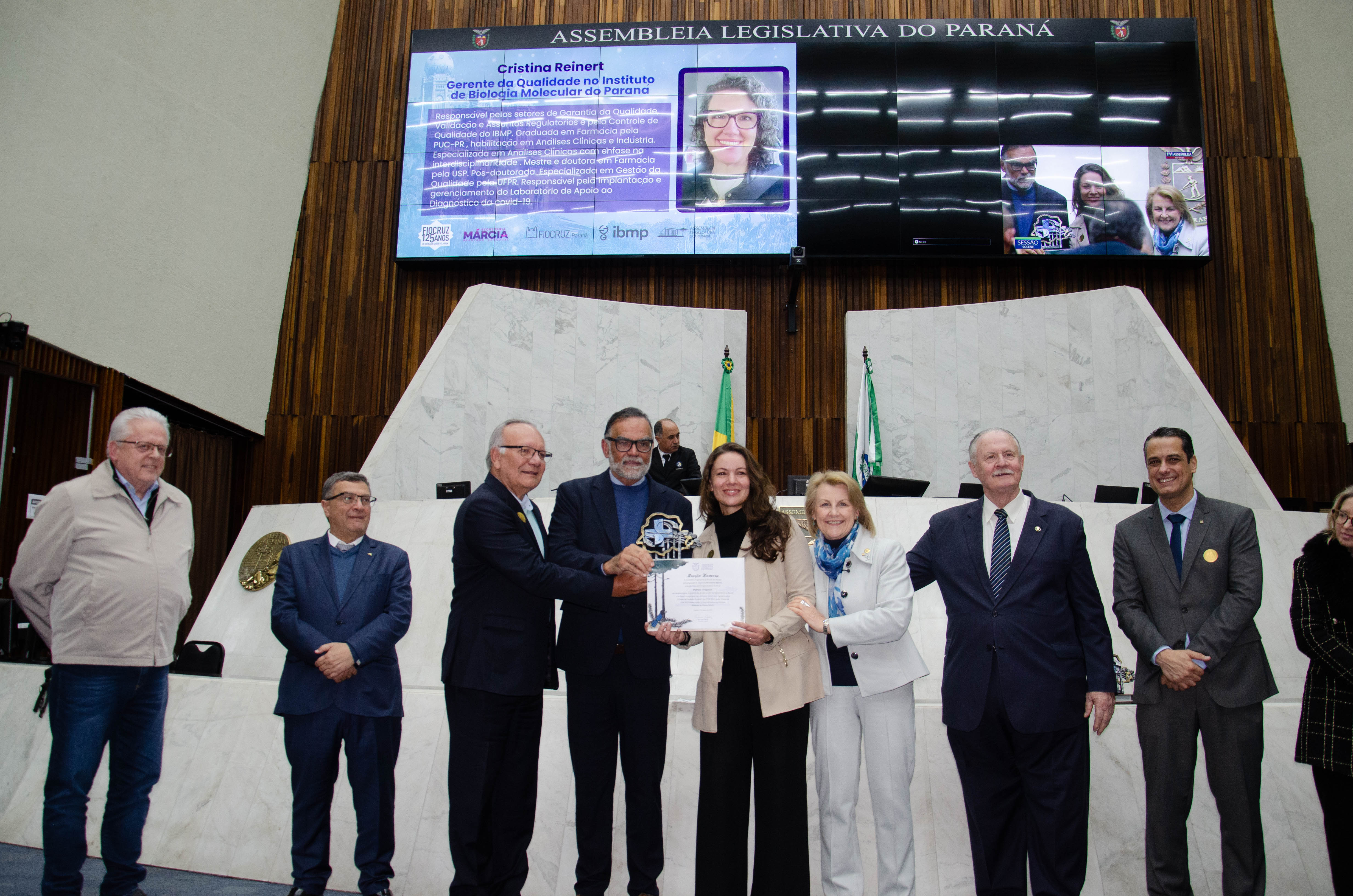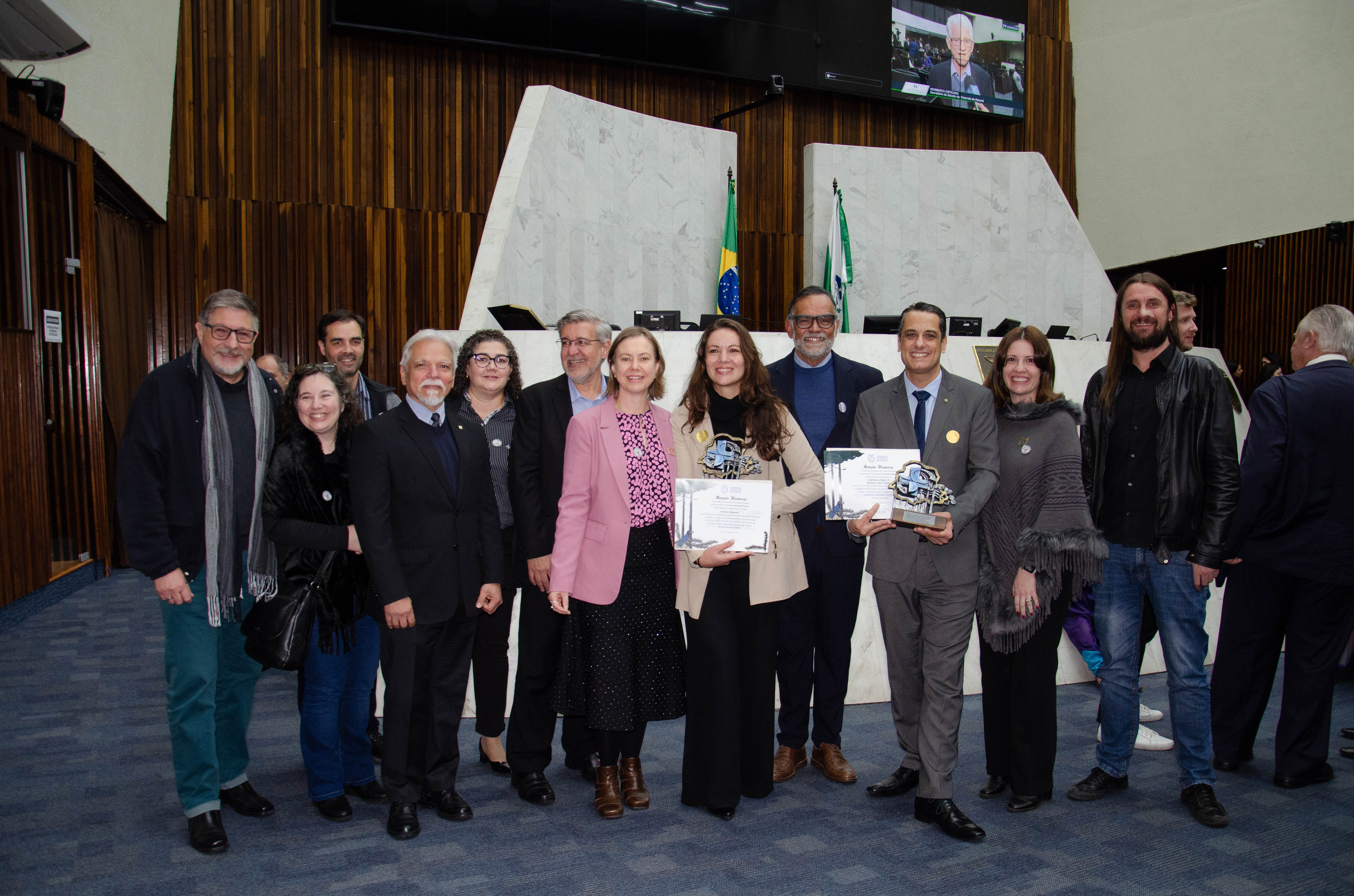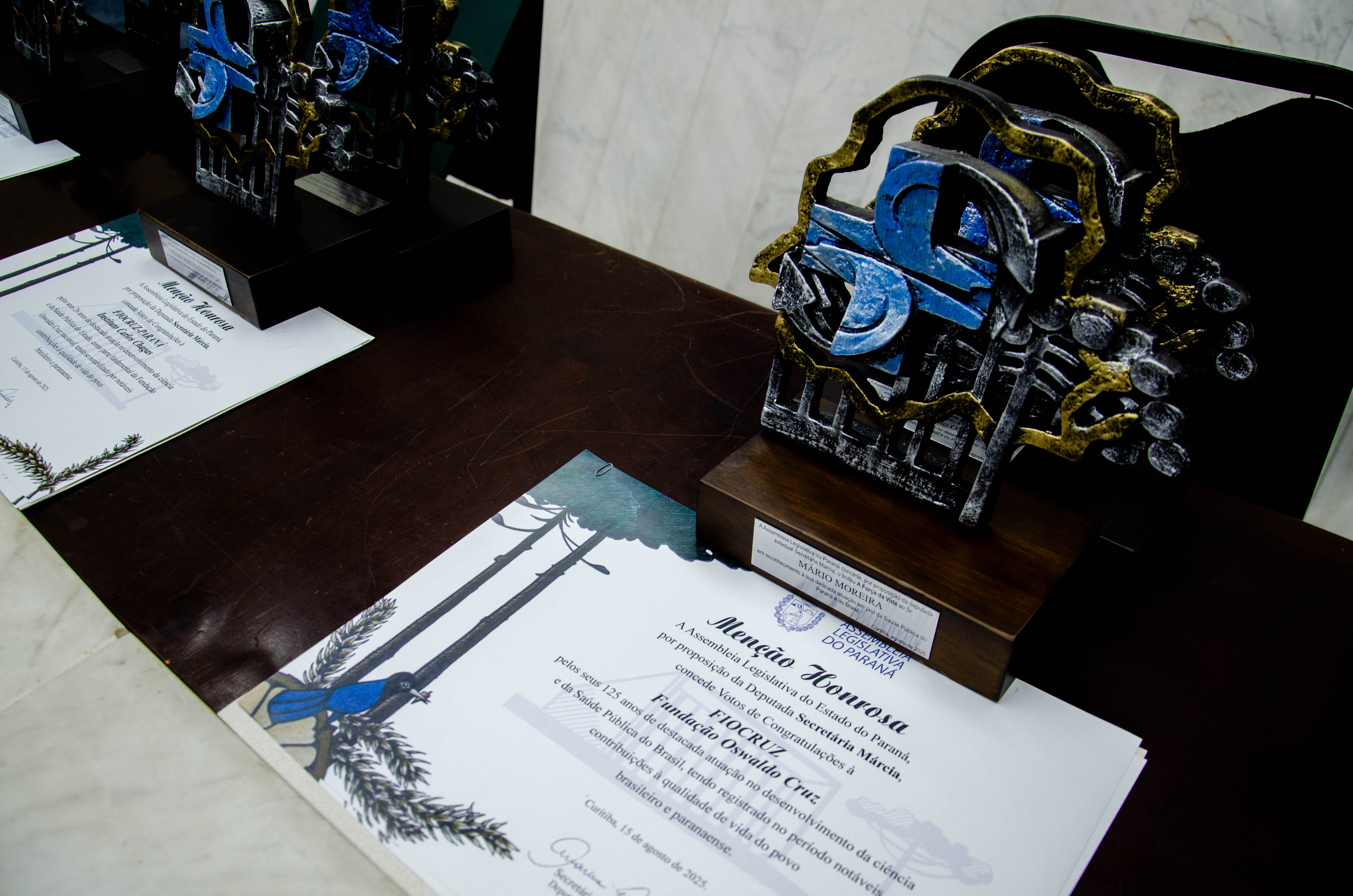 Ao todo, a Assembleia Legislativa entregou 12 homenagens a gestores e pesquisadores vinculados à Fiocruz, à Fiocruz Paraná e ao IBMP. O troféu entregue aos condecorados trazia o símbolo do SUS em meio ao território paranaense, ladeado por uma araucária, árvore símbolo do estado.