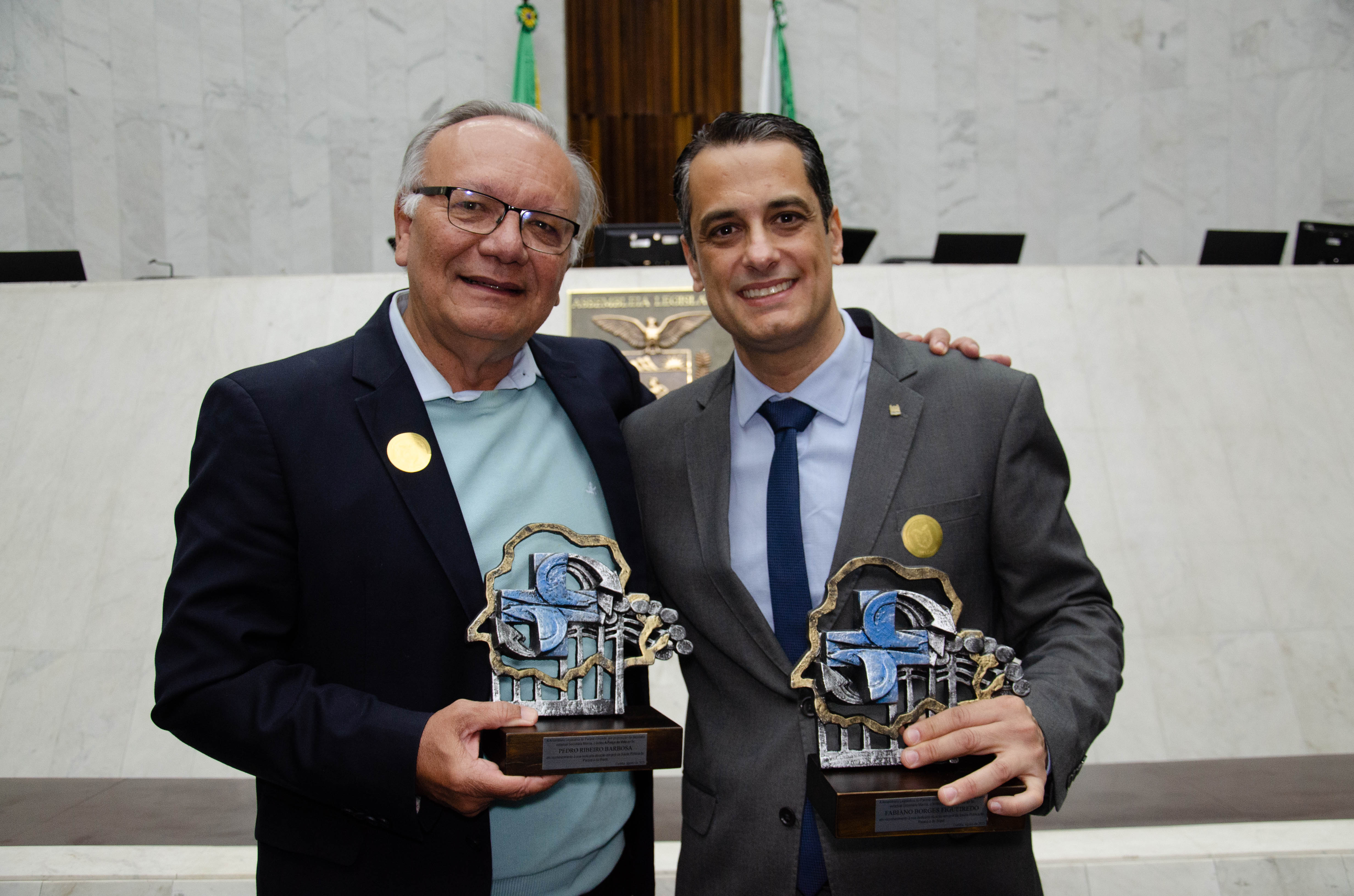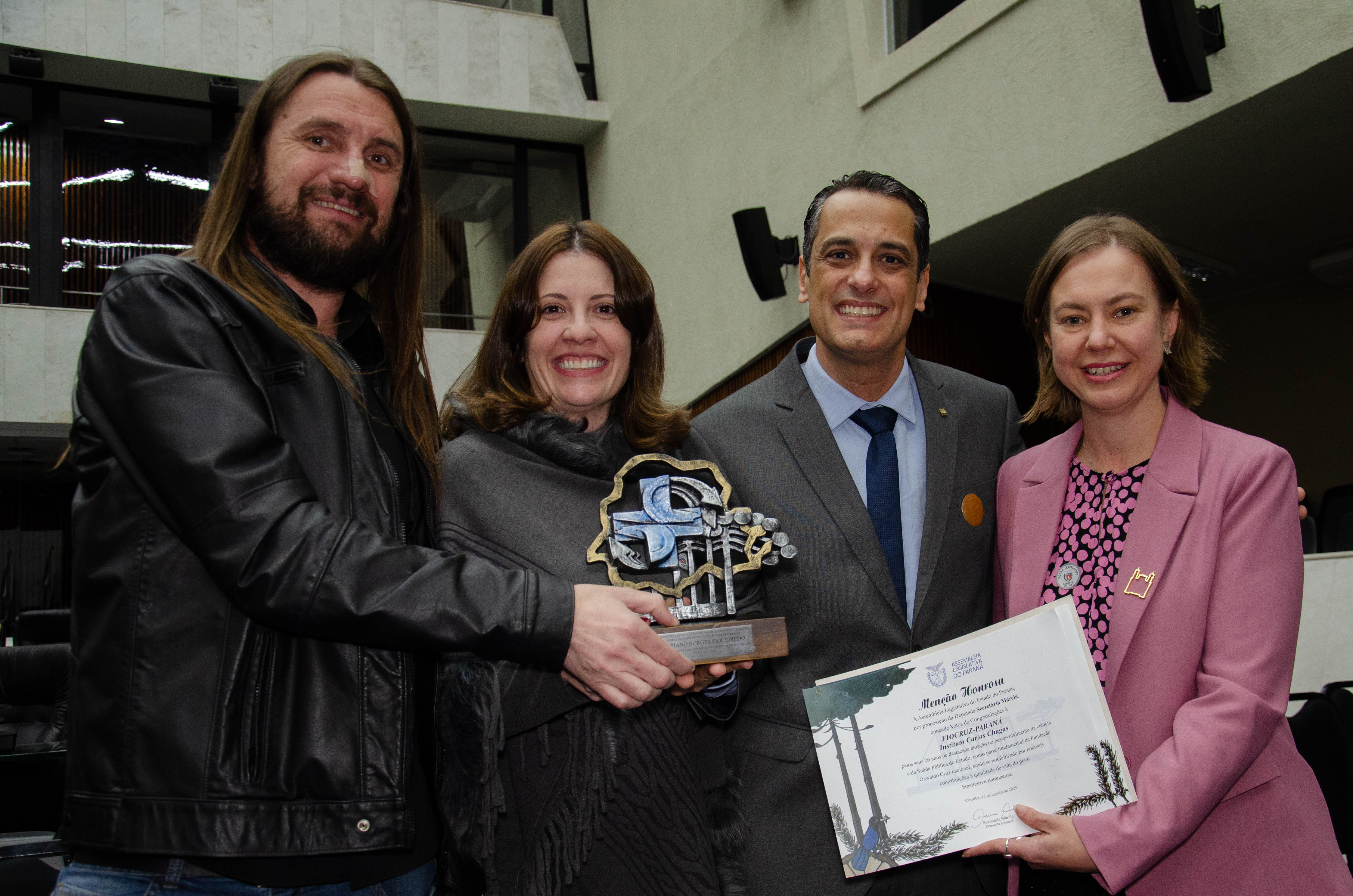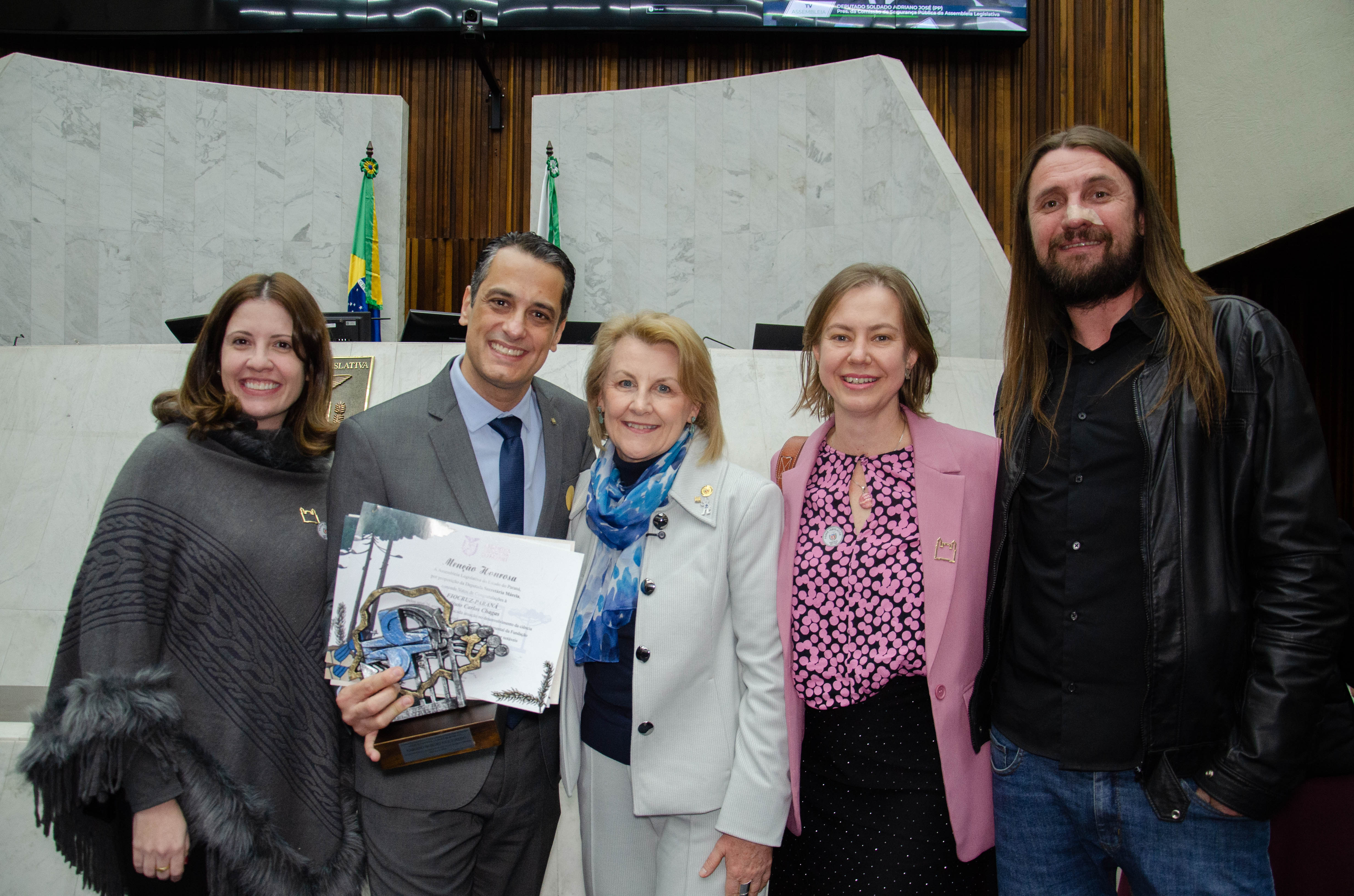 Ao todo, a Assembleia Legislativa entregou 12 homenagens a gestores e pesquisadores vinculados à Fiocruz, à Fiocruz Paraná e ao IBMP. O troféu entregue aos condecorados trazia o símbolo do SUS em meio ao território paranaense, ladeado por uma araucária, árvore símbolo do estado.
