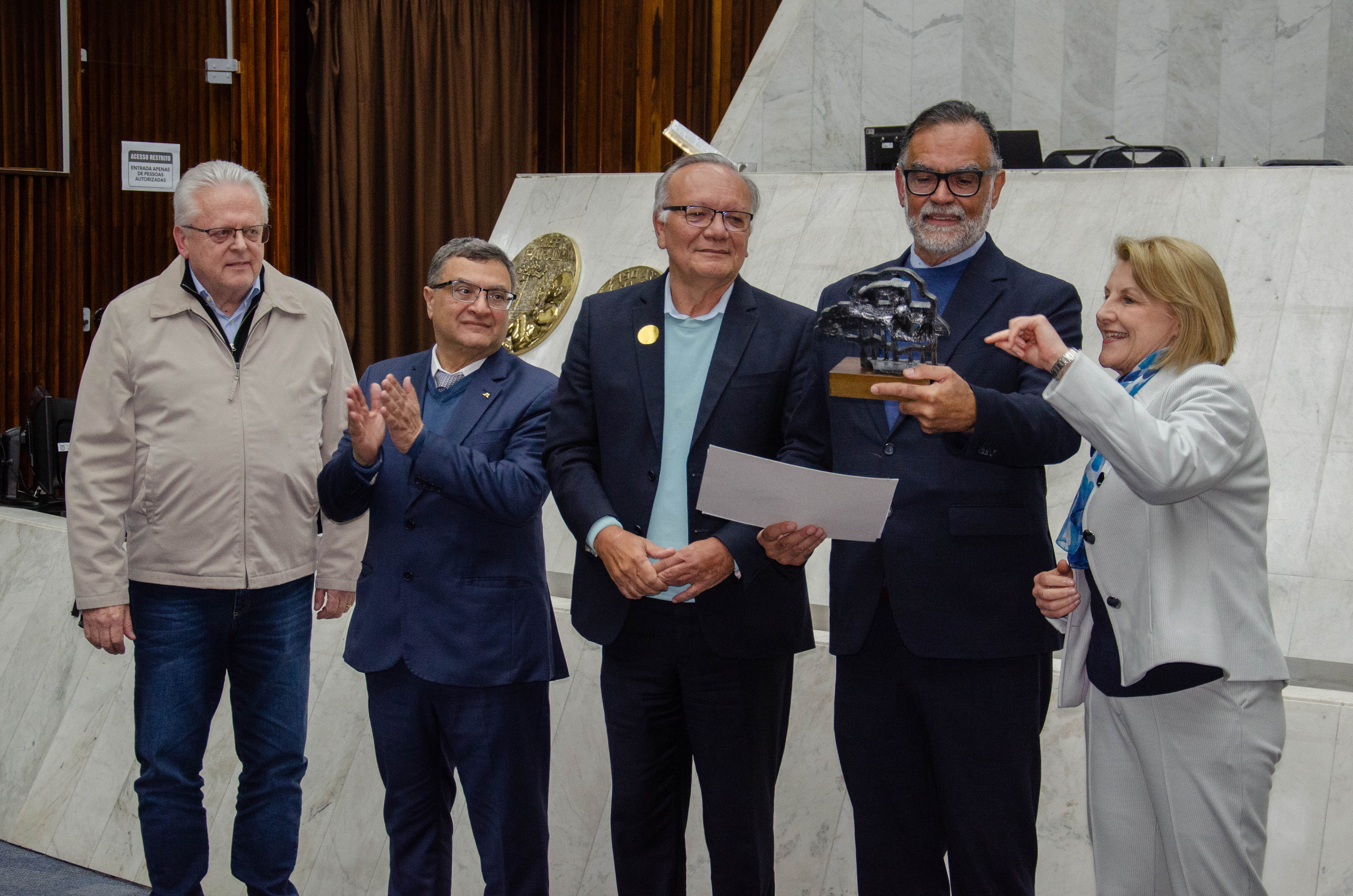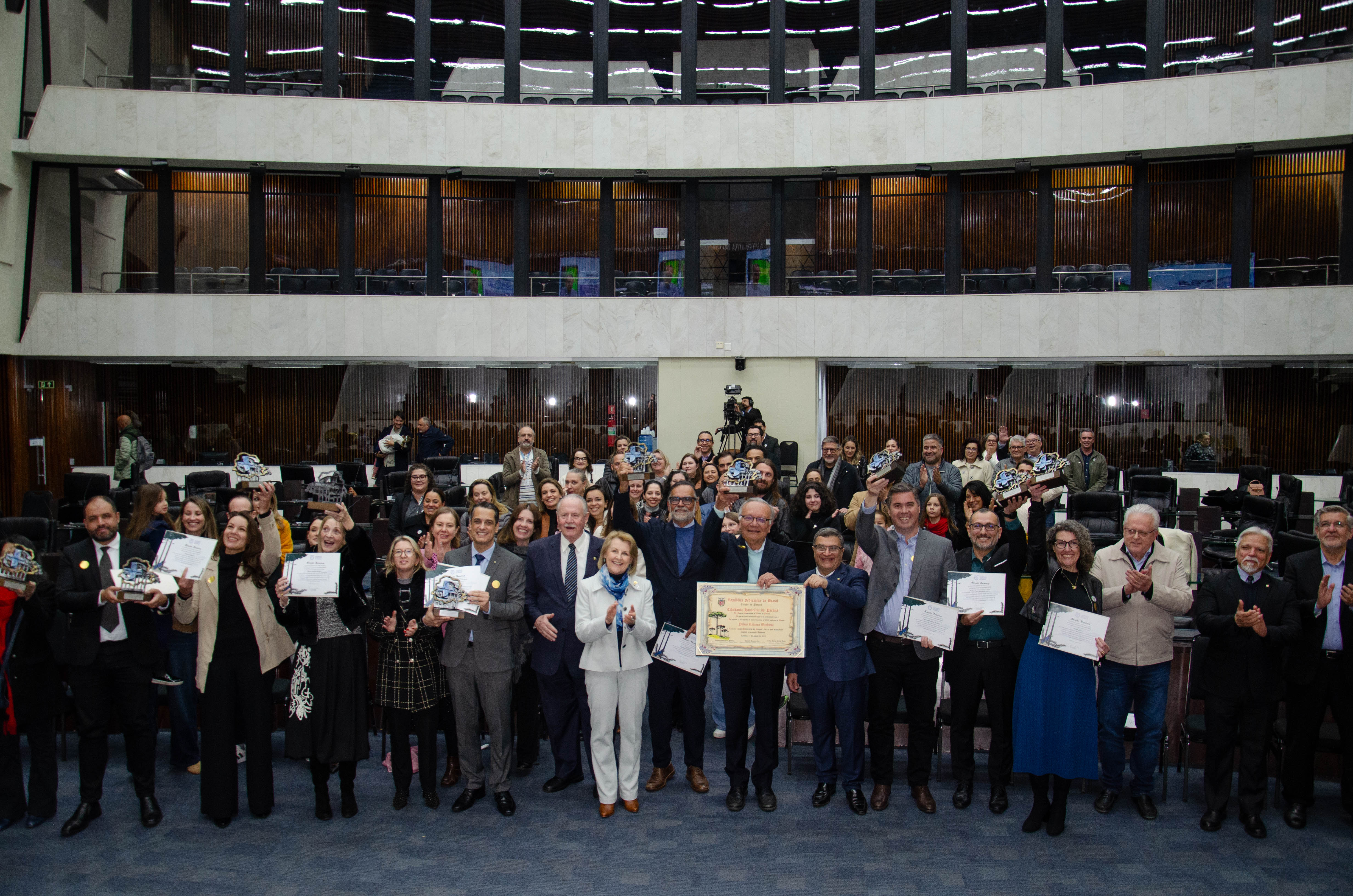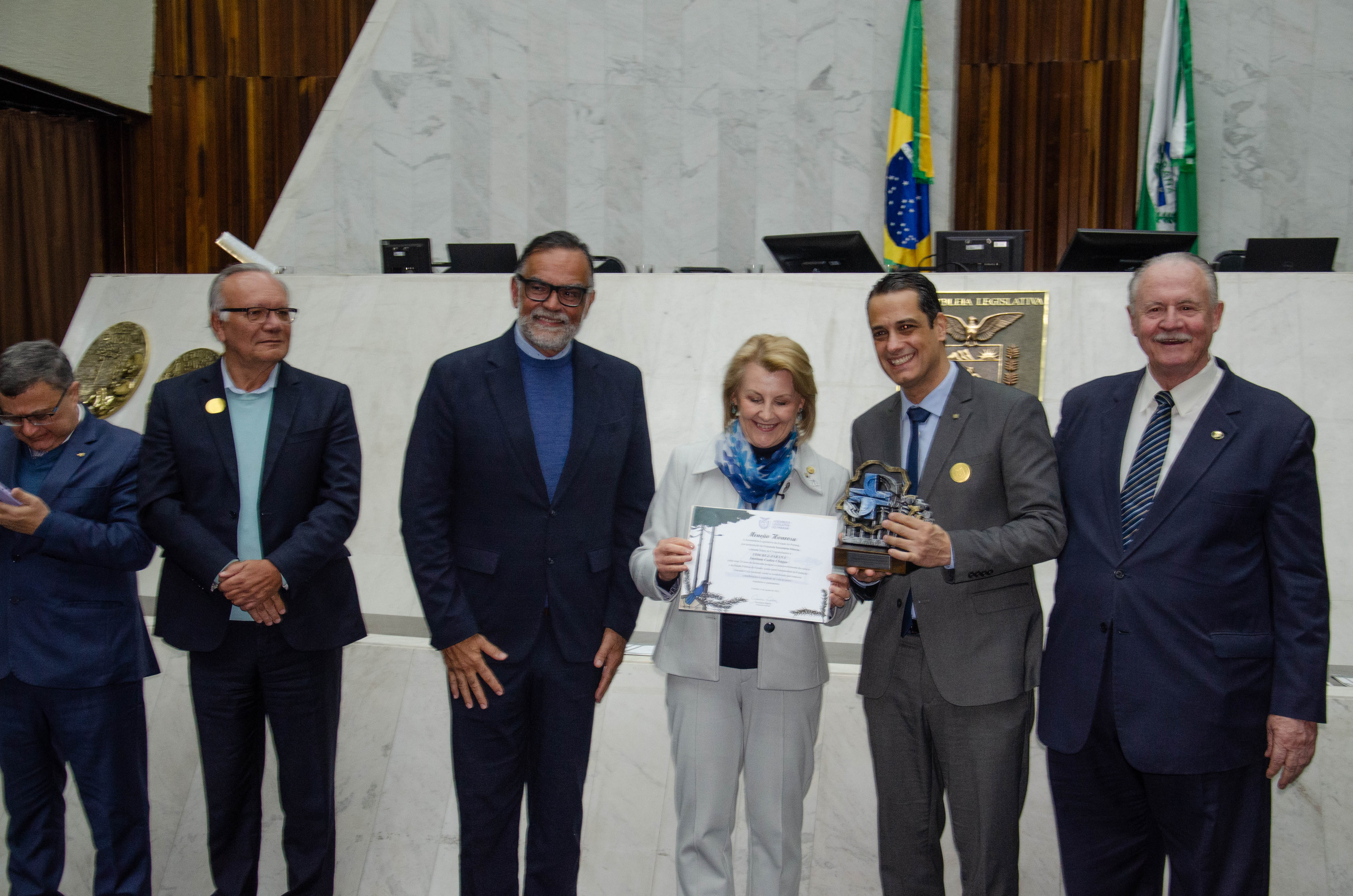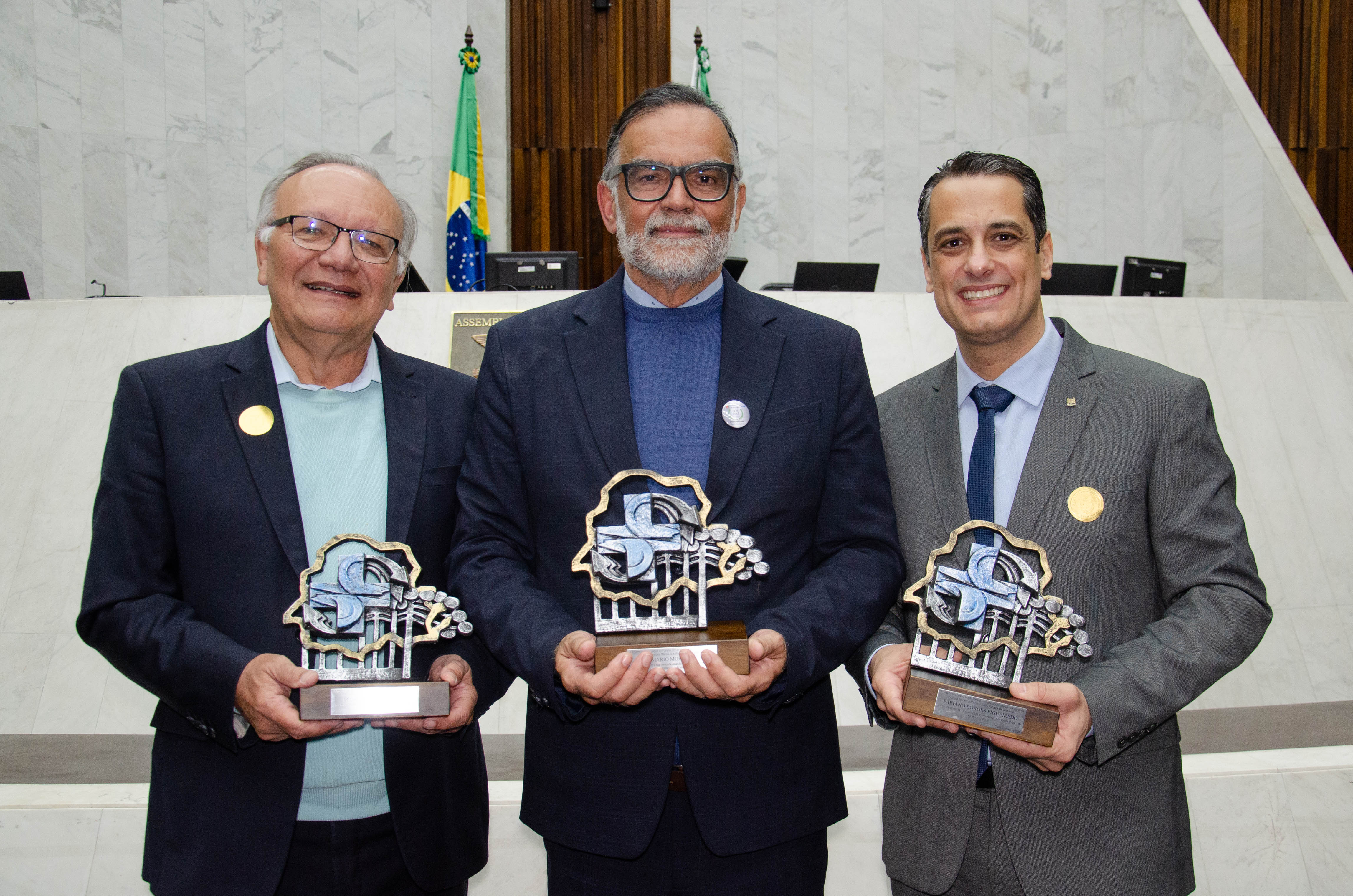 Ao todo, a Assembleia Legislativa entregou 12 homenagens a gestores e pesquisadores vinculados à Fiocruz, à Fiocruz Paraná e ao IBMP. O troféu entregue aos condecorados trazia o símbolo do SUS em meio ao território paranaense, ladeado por uma araucária, árvore símbolo do estado.